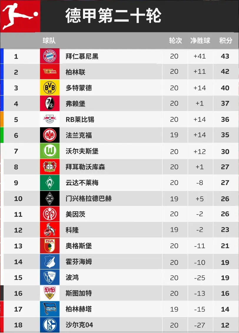 目前,德甲联赛的积分榜排名如下1拜仁慕尼黑,得分61 2莱比锡红牛,得分57 3多特蒙德,得分43 4沙尔克04,得分42 5勒沃库森,得分42 6沃尔夫斯堡,...
